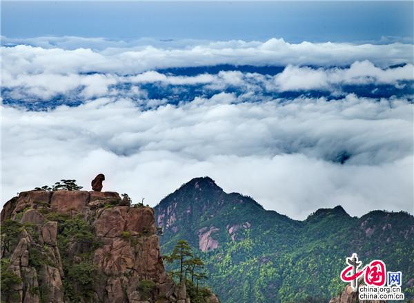 云海是黃山美景的精髓與靈魂所在,如上帝的神來之筆,賦予了黃山深邃含蓄的意境。黃山植被覆蓋率高,溫潤(rùn)的水汽常年縈繞,跟著風(fēng)游走,或聚或散,或濃或淡。云衫映幽山,薄霧罩峰巒,疑似仙境銀河墜落人間。
