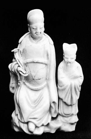 這件白瓷供養(yǎng)人像,為德化瓷人物像,釉面為純白色,色澤光潤明亮。整件雕塑由兩個人物構成,一大一小,一主一副。主像高13.7厘米,身穿典型的明代服飾,人物端坐在山石上,衣著瀟灑,神態(tài)自然從容,盡顯雍容華貴,而手執(zhí)如意則似乎暗示著他內心的向往和追求。整個構圖自然放松,給人一種輕松的感覺。小人物則是長髯飄灑,笑容和藹可親,似乎帶著點職業(yè)習慣的微笑,雖然年紀比較大,但卻處于仆從的位置,手里還抱著一卷書。從一個側面烘托出了年輕主人的身份。