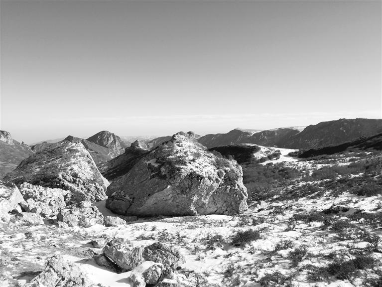 穿過公路就來到露骨山腳下,山間灌木叢生,枯葉凋零,一夜的小雪也使天空更加清澈。上山的路,總體是溯溪而上,不過腳下的小溪已經(jīng)變成冰河,但潺潺水聲不時(shí)在耳邊響起,大小石塊橫亙?cè)诒又希籽└采w其間,我們一行沿著前人在雪地留下的腳印,撥開齊胸的灌木枝,深一腳淺一腳、兜兜轉(zhuǎn)轉(zhuǎn)向前行。
