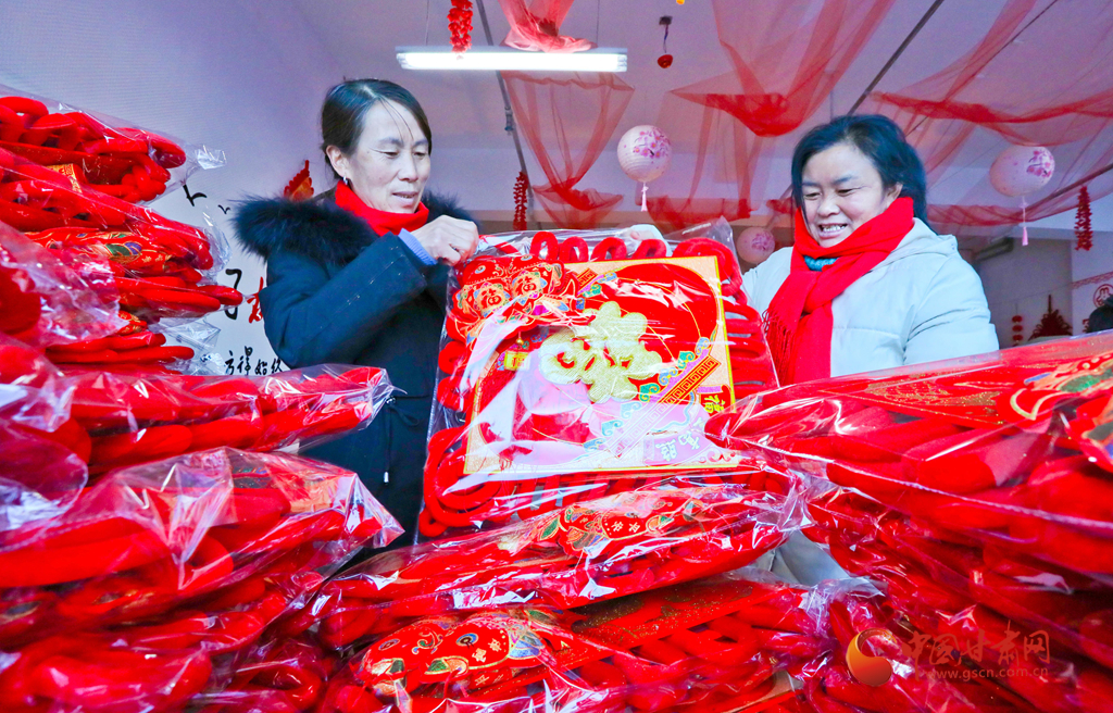 1月6日,甘肅民樂生態(tài)工業(yè)園區(qū)的巾幗扶貧車間內(nèi),女工們在包裝編織好的中國結(jié)準備發(fā)運。