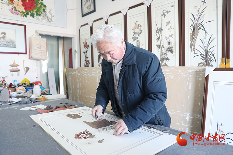 民樂(lè)縣宮燈制作代表王秀娥正在繡制孔雀手工藝品