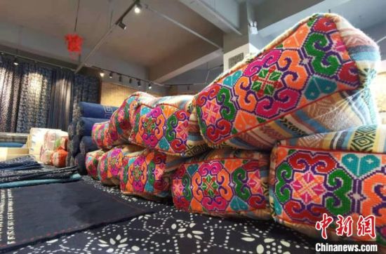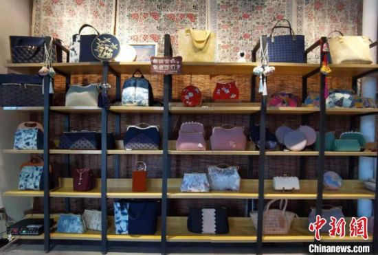近日,中新網(wǎng)記者在安定區(qū)一家非遺工坊內(nèi)見(jiàn)到祁輝,她身著正紅色漢服,腰間掛著香囊,穿梭于服飾區(qū)、布偶區(qū)和染布區(qū)之間。記者看到,工坊內(nèi)展出商品種類(lèi)多樣,色彩豐富,包括潮流挎包、時(shí)尚發(fā)卡、卡通布偶、可愛(ài)抱枕,以及扎染服裝和圍巾等,在極具古風(fēng)創(chuàng)意的同時(shí),還不乏國(guó)潮設(shè)計(jì)理念。
