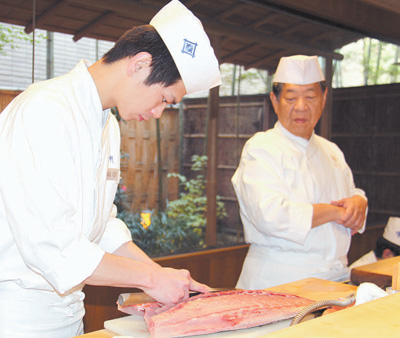 日本一名年輕和食廚師正在學習處理食材。記者 劉軍國