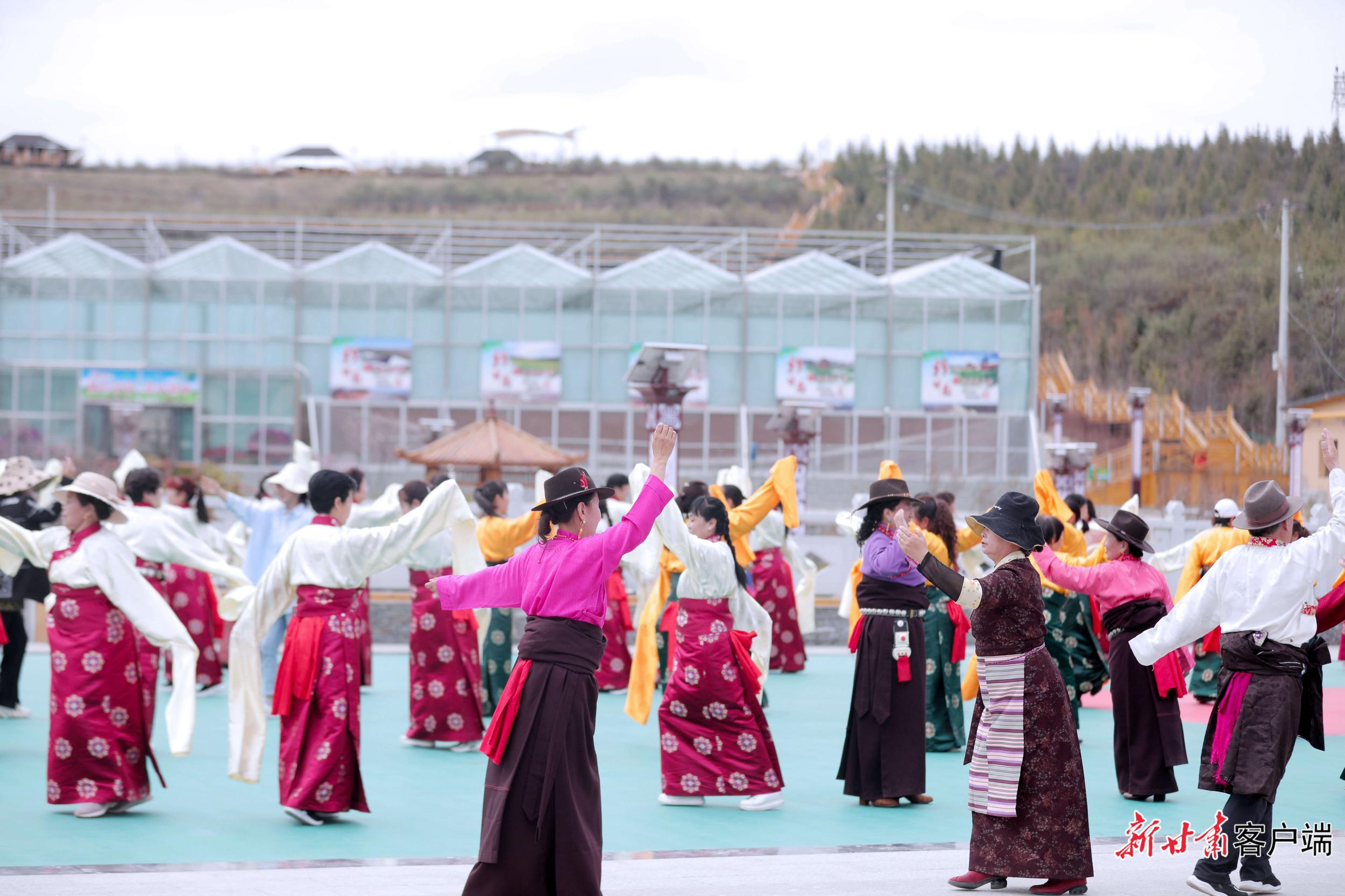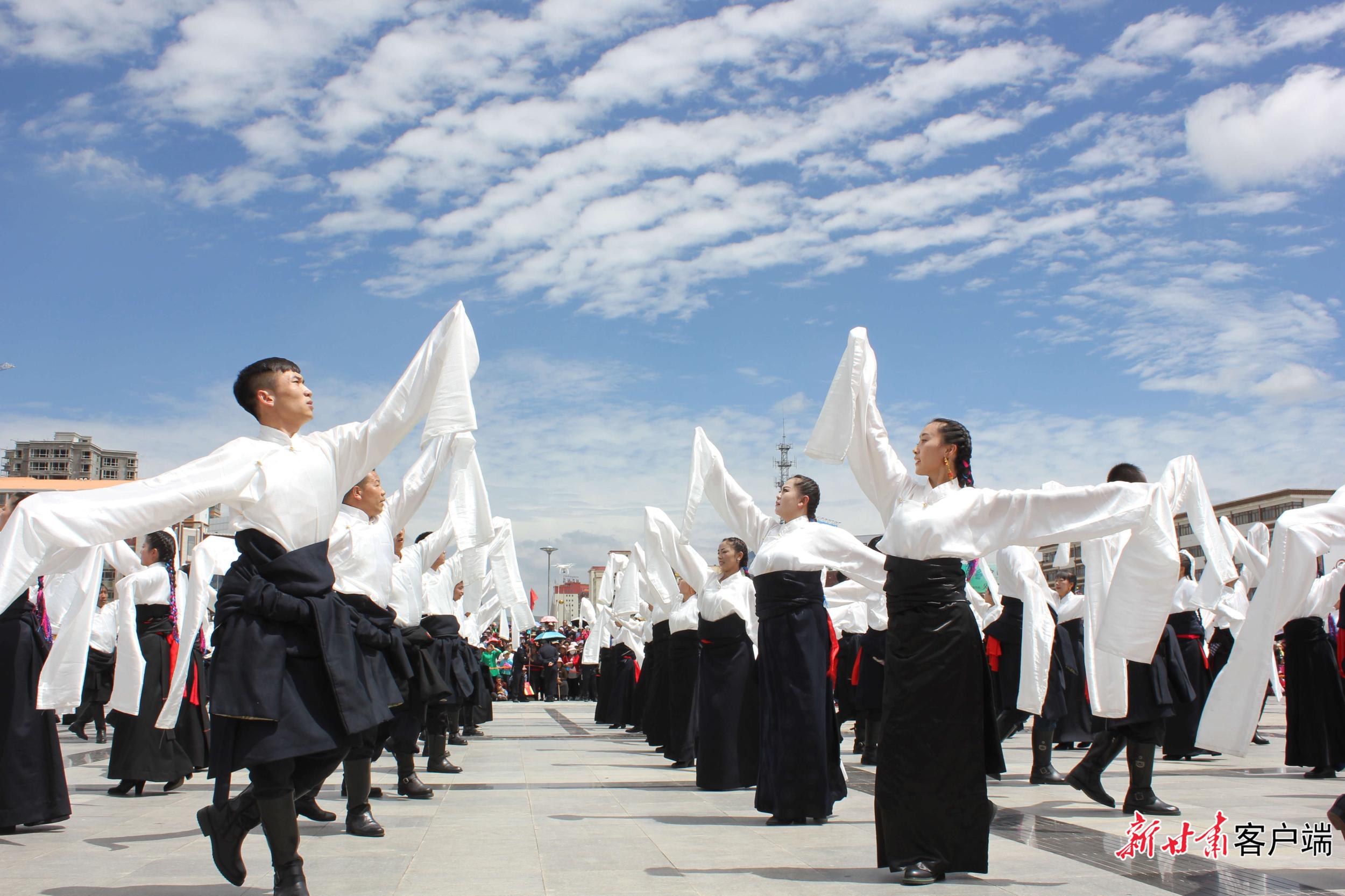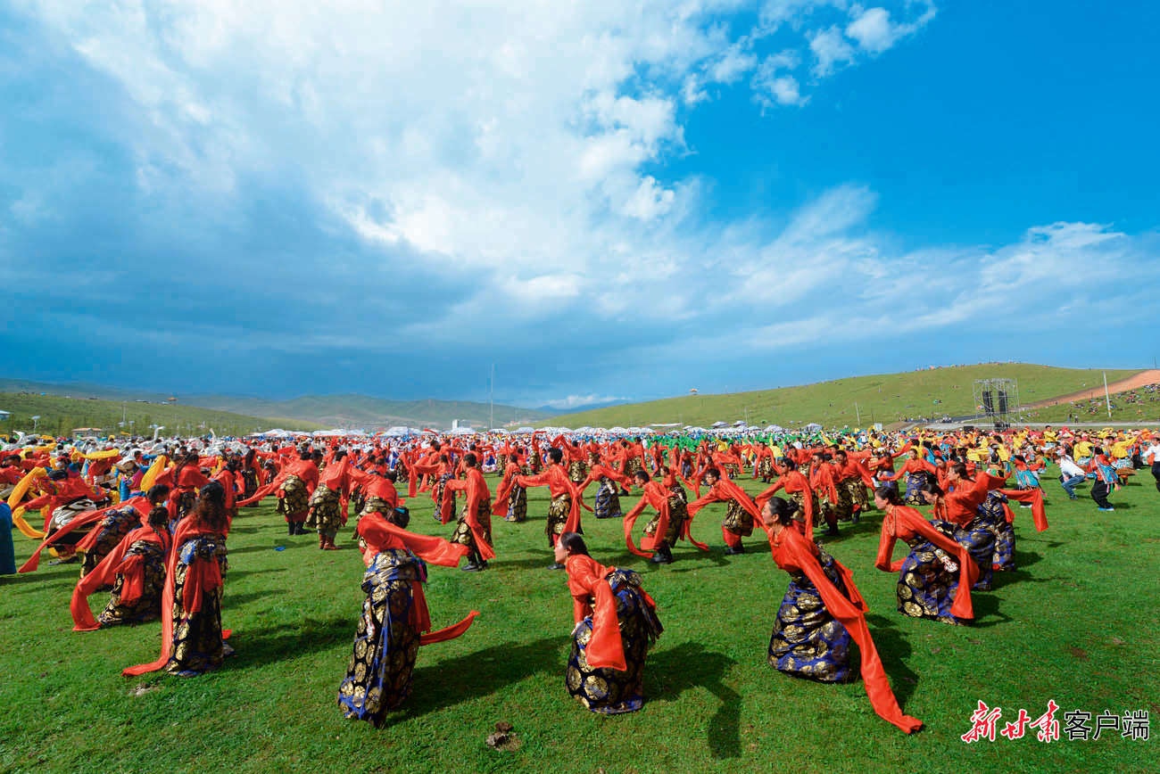 5月29日,在距離合作市區(qū)2公里處的加拉尕瑪村,隨著《吉祥甘南》優(yōu)美的旋律,游客與身著特色民族服裝的藏族兒女,和著優(yōu)美的節(jié)拍跳起了鍋莊舞。動聽的樂曲、颯爽的舞姿、五彩的服裝,讓當周草原陷入了一片歡樂的海洋。