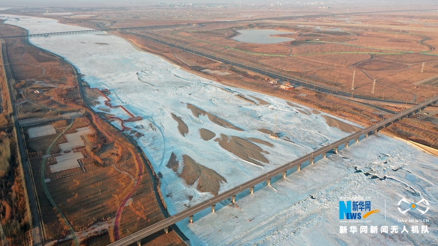 這是1月20日在甘肅省張掖市甘州區(qū)航拍的黑河。新華網(wǎng)發(fā)(楊永偉 攝)