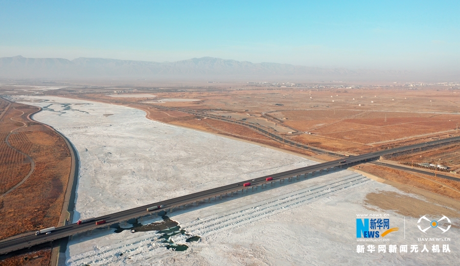隆冬時節(jié),流經(jīng)甘肅省張掖市甘州區(qū)的黑河河水結(jié)冰,銀裝素裹,從空中俯瞰如一條白色飄帶蜿蜒。