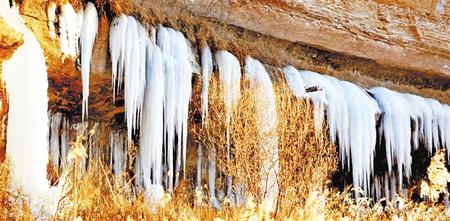 小路隨著山勢,曲折延伸。對面荒坡上隨處可見大大小小的洞穴,不知是經(jīng)年風蝕,還是人工開采沙子所致。洞穴四周,散落著小小的冰瀑,有的似乎只有盈盈一握。長長短短的冰掛,一綹一綹,一排一排,遠遠近近錯落有致地覆在山坳里,垂在砂石間,掛在懸崖上。一些細細長長的冰溜,像極了臘月里母親剛出鍋的粉條。搭在院子竹竿上的一掛粉條,下邊還垂著水珠,上邊早已凍成了細細的冰棒,而滴落在地上的水已凝成了冰堆。