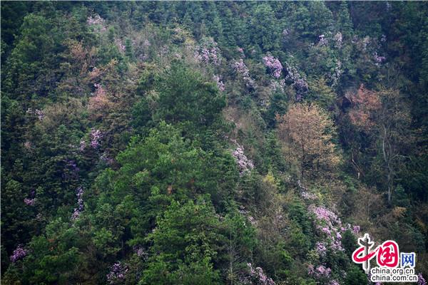 春天的穿巖山國家森林公園,漫山花開,層林盡染春色。這時候的野櫻花、野杜鵑、野映山紅竟相綻放,條條游步道宛如一條條花帶,帶著生機(jī)勃勃和滿天飄舞的芳香,讓游人心曠神怡。走在一條條蜿蜒的棧道,鮮氧環(huán)伺,鼻息間盡是春風(fēng)吹來的清新氣息。這里人文歷史與自然美景交融,既可在蜿蜒的茶馬古道,重走紅軍路,感受偉大的革命精神,又可在越河而建、凌空百丈的5D玻璃橋體驗漫步云端的驚險刺激,還可在寧靜愜意的云端古村落,感受淳樸的民風(fēng)和歷史悠長的農(nóng)耕文化奇葩。早晨的日出云海,中午的藍(lán)圖白云,下午的燦爛夕陽,鮮花與藍(lán)天、彩霞相映,讓人流連忘返。漫山遍野的綠意間,成團(tuán)櫻花、杜鵑、映山紅等夾雜其中,或粉紅或雪白,或紫色或丹紅,密密匝匝開滿枝頭。由于雪峰山景區(qū)的落差較高,從300米到1500米,櫻花期、杜鵑花期、映山紅花期交錯,成梯級往山背梯田景區(qū)、虎形山大花瑤綻放開來,讓賞花期能長達(dá)2、3個月之久。