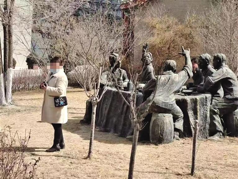 記者在水車博覽園看到,幾名游客翻越圍欄徑自從剛剛吐露新芽的草地上穿過,有的游客在雕塑上攀爬、玩耍,甚至坐臥在雕塑上拍照,這些行為不僅對園內(nèi)設施造成了損壞,也對個人和城市造成了不好的影響。