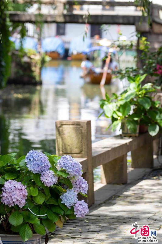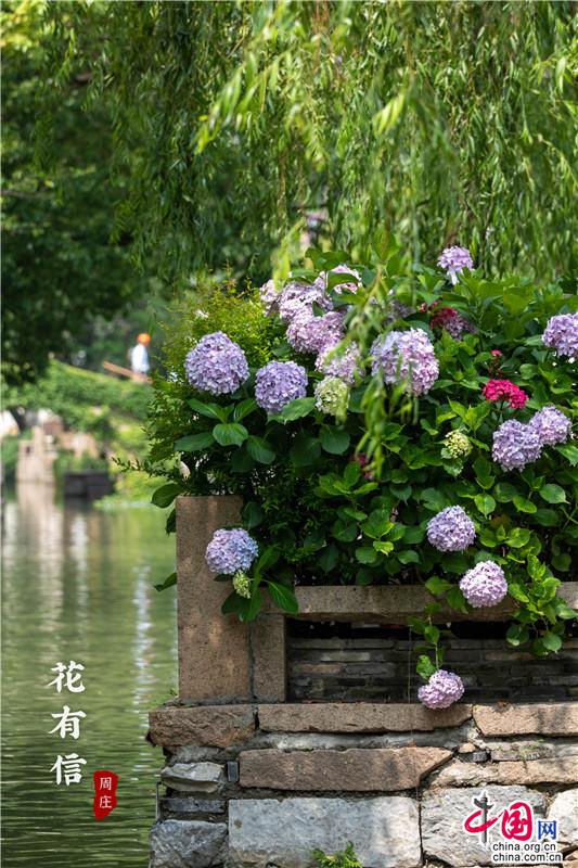 花團(tuán)錦簇一詞大約是為繡球量身定制,微風(fēng)一曳,波光親吻一曳。藍(lán)紫開(kāi)遍,彌漫的淡淡花香讓春天的信使忍不住沉溺其中,周莊的浪漫大抵關(guān)乎世間一切。