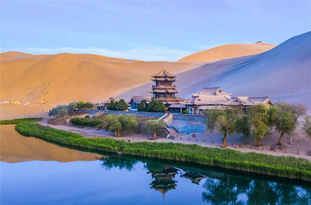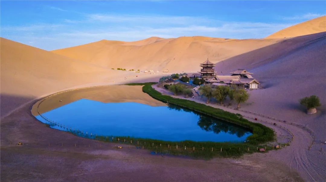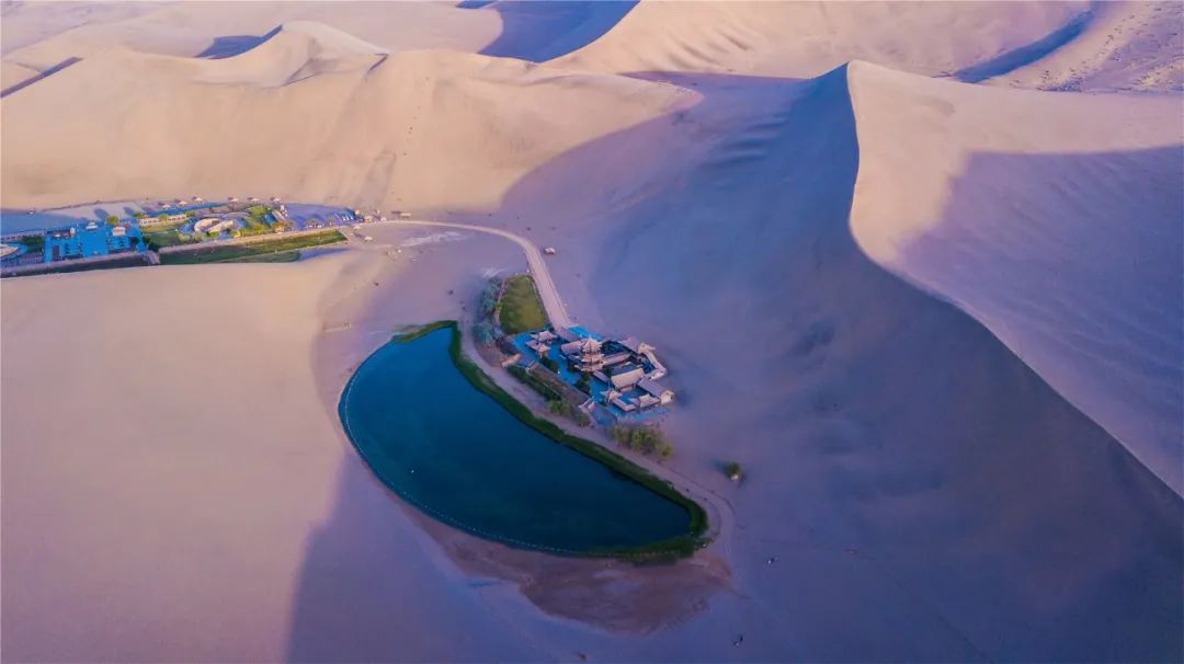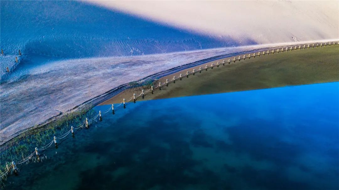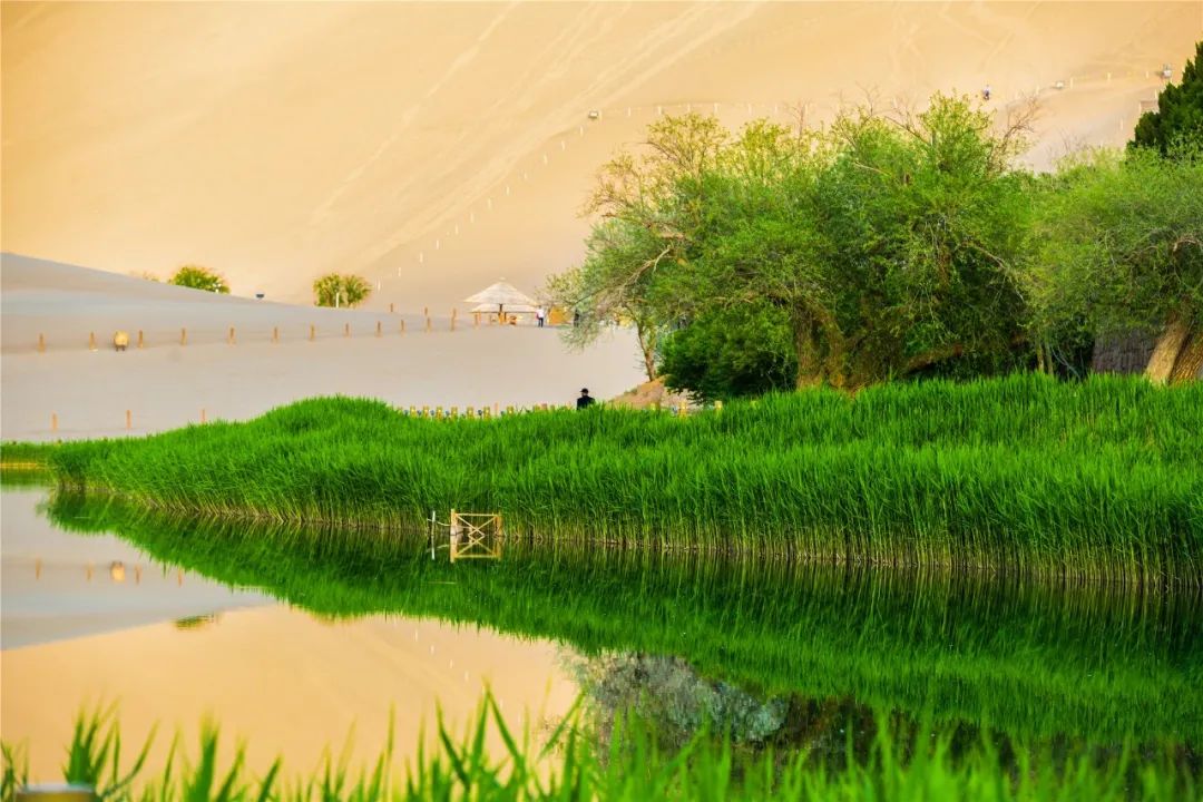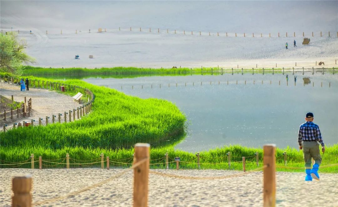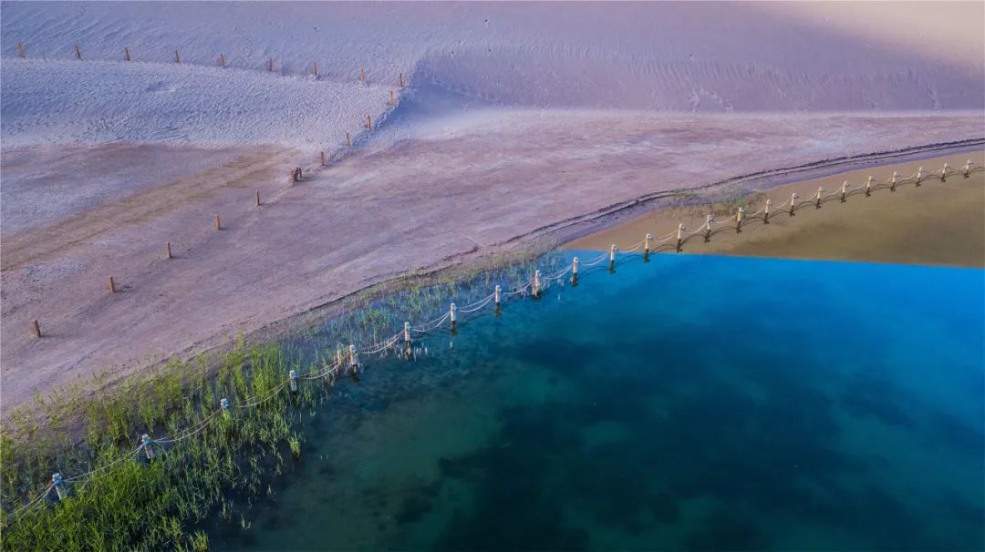 今年4月,敦煌市氣候溫潤,雨水較多,鳴沙山月牙泉景區(qū)草木蔥蘢,月牙泉水位持續(xù)上升。從4月23日在月牙泉航拍的圖片可以看出,月牙泉水域面積逐漸擴大,泉水已滲出月牙泉圍欄之外近1米的距離。據(jù)悉,3年前月牙泉泉水一直保持在圍欄之內。