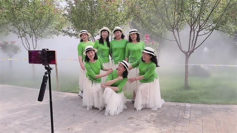 上午9時(shí)30分,水池中漸漸漫出淡淡的煙霧,時(shí)而稀薄,時(shí)而濃厚,隨著陣陣微風(fēng)飄蕩在小橋流水間。“準(zhǔn)備放音樂,我在原地來回轉(zhuǎn),你用手機(jī)豎屏拍。”……記者穿梭于人群間,這樣的聲音不絕于耳。“姐妹花”龔大姐和田大姐身穿正裝,各自圍上了顏色艷麗的圍巾,正站在鏡頭前直播。“這里非常美,像仙境一樣。綠化也做得特別好,公園里的綠植和鮮花種類繁多,很好看。我們是第一次來,希望蘭州多打造一些這樣的美景。”
