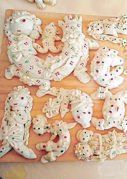 靜寧人的花饃饃,正是應和了消病消災、祈求平安的民間心理。端午禮儀中的面塑,表達著人們對美好事物的向往和祈禱。雖然是以食物的面目出現(xiàn),但那些充滿靈性的造型,卻飽含著人文的意蘊。靜寧人塑成動物的面花中,最多的是蟾蜍和蛇。蛇面花多是盤成一團的,沒有攻擊性又溫和的樣子。蟾蜍面花本地人叫“癩呱子”,形象很可愛,多的是兩只后足弧形對稱,蜷在腹部兩側(cè);兩只前足在頭頂相合,呈環(huán)抱姿態(tài)。也有別出心裁的婦女,會做出十二生肖之類的面花,這些面花,修飾并不夸張,其神韻更勝于外在的精致技巧。所有的端午面花都寄寓著大人們的祈福,但孩子們最喜歡的是動物面花,古靈精怪的,讓他們舍不得摸,更舍不得吃,只能與荷包一起掛在胸前賞玩,或與鄰家的小孩子一起比,看誰的媽媽手更靈更巧。