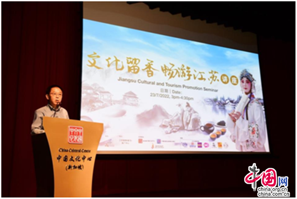 由江蘇省文化和旅游廳主辦、江蘇旅游(新馬)推廣中心協(xié)辦,新加坡中國文化中心、中國駐新加坡旅游辦事處及新加坡江蘇會全力支持的“文化留香·暢游江蘇”講座,于2022年7月23日(星期六)在新加坡中國文化中心4樓劇場舉行。江蘇省文化和旅游廳副廳長李川通過連線參與本次活動,新加坡旅游局助理署長(國際司)陳蕙敏、中國文化中心兼中國駐新加坡旅游辦事處主任肖江華、江蘇省駐新加坡經貿代表處主任代表沈立國,以及來自新加坡文化藝術界、旅游界、商界、社團、新聞媒體及市民大眾等逾200名觀眾現(xiàn)場出席活動。