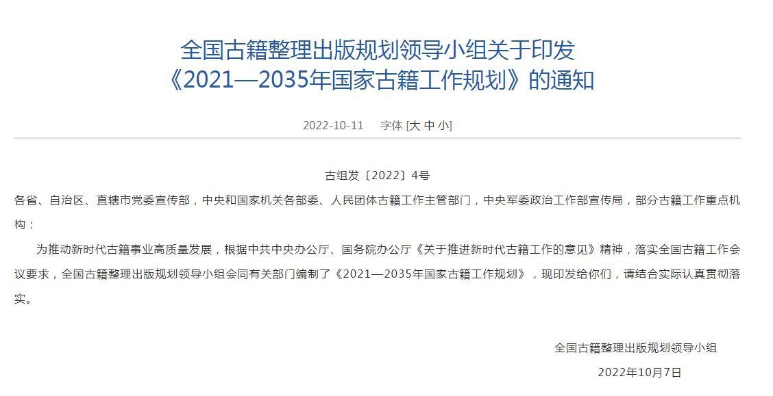 根據(jù)規(guī)劃,到2035年,古籍工作體制機制更加完善,標(biāo)準(zhǔn)規(guī)范體系基本健全,古籍保護、 整理研究和編輯出版成果豐碩,質(zhì)量明顯提升,古籍?dāng)?shù)字化資源建設(shè)取得重要進展, 古籍普及深入推進,人才隊伍發(fā)展壯大,古籍工作在傳承和弘揚中華優(yōu)秀傳統(tǒng)文化中的作用更加突出。