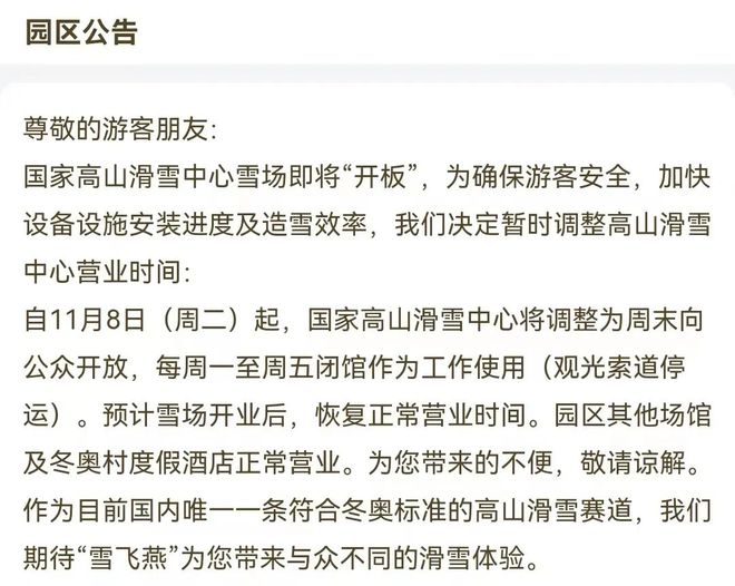根據(jù)公告,自11月8日(周二)起,國家高山滑雪中心將調(diào)整為周末向公眾開放,每周一至周五閉館作為工作使用(觀光索道停運(yùn))。預(yù)計雪場開業(yè)后,恢復(fù)正常營業(yè)時間。目前,“雪飛燕”已對外開放,如果纜車開放,便可以乘坐纜車上到山頂。