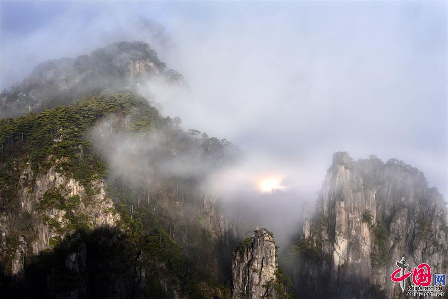 在黃山風(fēng)景區(qū)的始信峰,群峰中時(shí)而云海翻騰,時(shí)而霧靄朦朧,時(shí)而艷陽高照,還出現(xiàn)了佛光奇觀,勾勒出一幅幅黃山獨(dú)有的勝景。