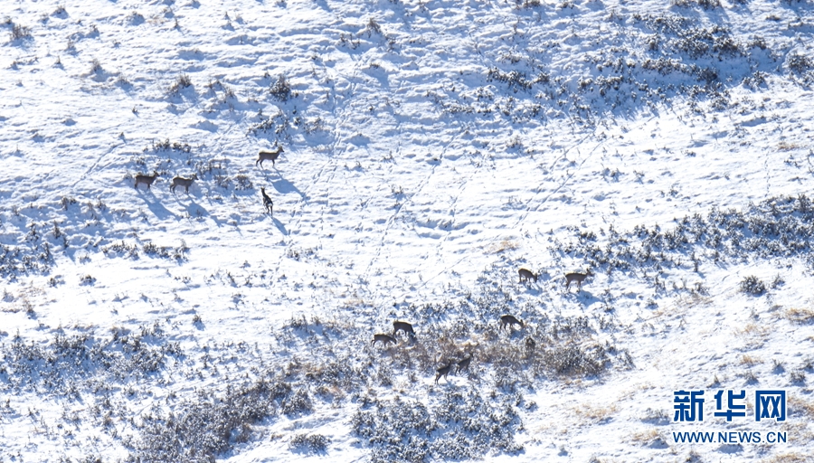 11月12日,一場降雪過后,祁連山國家公園甘肅省張掖市民樂縣境內(nèi)被一層薄薄的白雪覆蓋,成群的野生狍鹿漫步在積雪覆蓋的山坡上。它們時而追逐玩耍,時而靜臥休息,時而覓食充饑,展現(xiàn)出一幅人與自然界和諧共生的畫面。