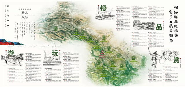 據(jù)介紹,手繪圖以“相約隴原促振興·富了口袋富腦袋”為主題,突出“圖文并茂、服務(wù)游客、便于攜帶、適于珍藏”等特點(diǎn),對(duì)2022年創(chuàng)建的6個(gè)鄉(xiāng)村旅游示范縣,60個(gè)文旅振興鄉(xiāng)村樣板村全部開發(fā)設(shè)計(jì)了電子“二維碼”,設(shè)置了甘肅省鄉(xiāng)村旅游60條四季精品線路,生動(dòng)形象地展現(xiàn)了甘肅鄉(xiāng)村旅游特色元素和資源產(chǎn)品信息,對(duì)幫助游客暢游甘肅鄉(xiāng)村、感知隴原文化、體驗(yàn)鄉(xiāng)村魅力具有重要意義。