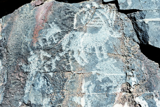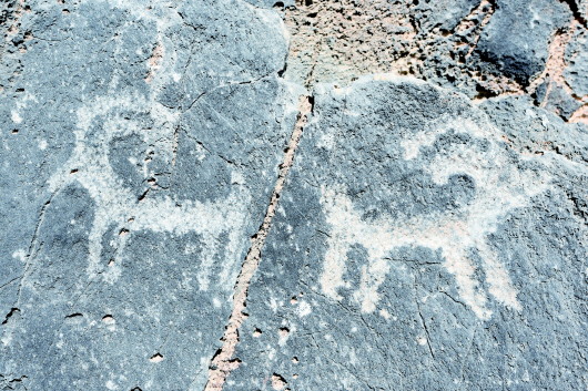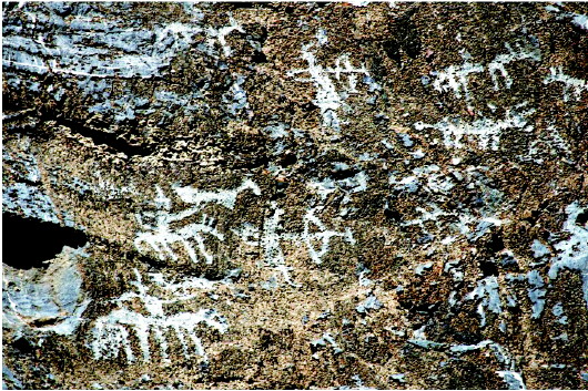 肅北縣大黑溝巖畫(huà)是全國(guó)重點(diǎn)文物保護(hù)單位,巖畫(huà)形成時(shí)間初步斷定在春秋、戰(zhàn)國(guó)至西漢時(shí)期,位于肅北縣城東約40公里處的大黑溝。巖畫(huà)共有34組,圖案190多幅,零亂分布在3.5公里長(zhǎng)的山溝中,畫(huà)面內(nèi)容多為射獵、放牧、練武、乘馬作戰(zhàn)等場(chǎng)景和北山羊、野牛、野駱駝等動(dòng)物,畫(huà)面表現(xiàn)形式多以凹刻和凸刻,巖畫(huà)大多刻在避風(fēng)向陽(yáng)的陡峭花崗巖和石灰石上。