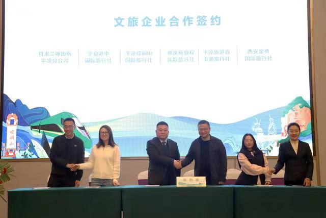 專題推介會上,平?jīng)鍪形幕瘡V電和旅游局推介了全市文旅資源及“引客入平”系列支持政策,崆峒山、大云寺·王母宮、龍泉寺、云崖寺等重點景區(qū)和涇川橙香瑤池溫泉酒店分別作了主題推介。平?jīng)鑫穆猛豆九c西安一帶一路文旅公司、涇川大云恒盛旅游公司與西安黃河國旅、崇信公劉文旅投公司與寶雞春暉旅行社、莊浪關(guān)山文旅投公司與寧夏新文化國旅、崆峒山國旅與重慶新旅程國旅、甘肅蘭神國旅平?jīng)龇止九c寧夏港中國旅、平?jīng)雎糜伟偈峦ㄅc西安金橋國旅等14家省內(nèi)外旅行社分別簽訂“引客入平”客源互送合作協(xié)議。推介環(huán)節(jié)還進行了《神仙留戀的好地方》《崆峒武術(shù)魂》《折柳》和《春天的芭蕾》等文藝表演,與會嘉賓參觀了“問道崆峒·養(yǎng)生平?jīng)?rdquo;文旅形象圖片展、文旅產(chǎn)品市集、非遺技藝展示及網(wǎng)絡(luò)直播和非遺文創(chuàng)產(chǎn)品展。甘肅省文旅廳有關(guān)處室、各相關(guān)市州文旅部門負責人和省內(nèi)外旅行商、文旅企業(yè)、媒體記者代表,平?jīng)鍪兄攸c景區(qū)、文旅投公司、文創(chuàng)企業(yè)代表共150余人參加。