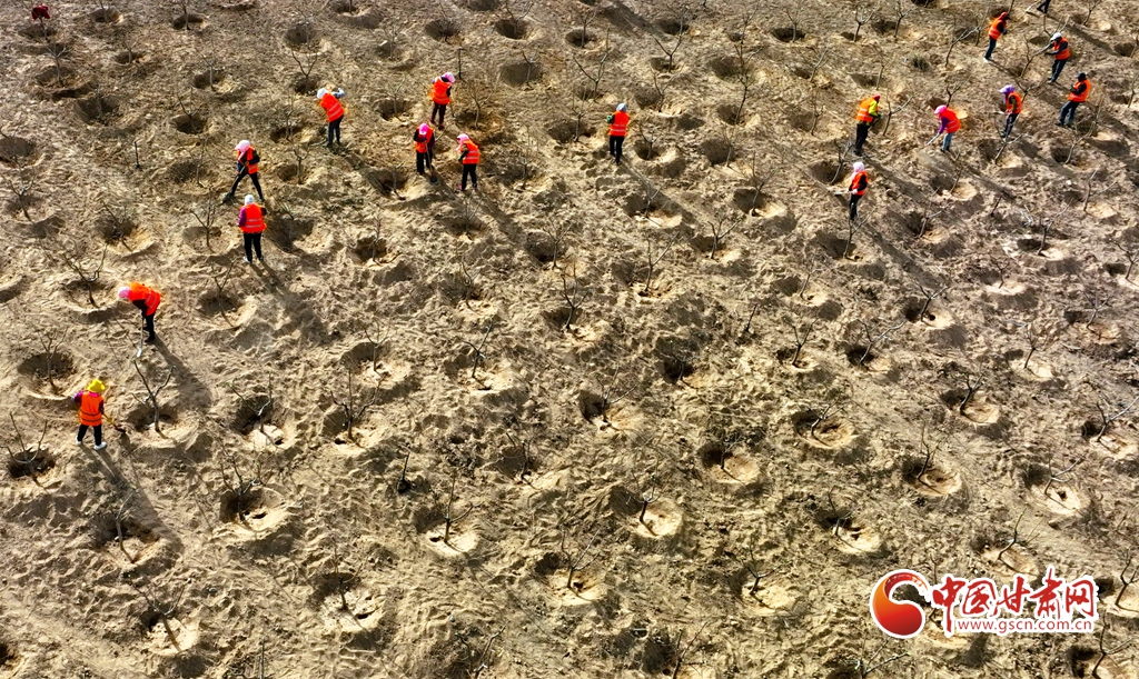 4月11日,在甘肅省張掖市甘州區(qū)黑河西岸黑河灘彩虹林海生態(tài)造林示范區(qū)內(nèi),眾多干部職工正在植樹(shù)。