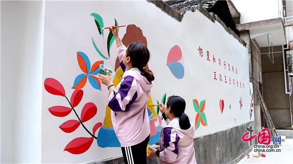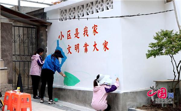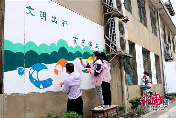 現(xiàn)場,大家手持畫筆和顏料板,相互分工協(xié)作,以墻為紙,認真細致的設(shè)計墻繪內(nèi)容,筆起筆落間,一幅幅栩栩如生、色彩絢麗的城市文明新畫卷躍然墻上。