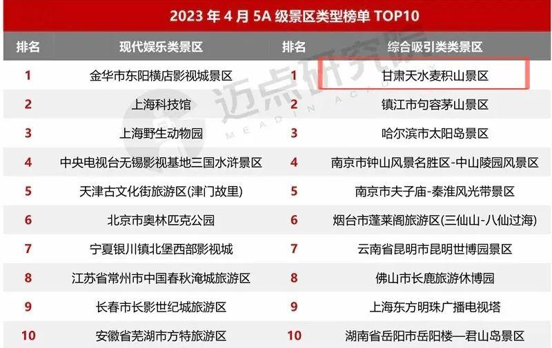 2023年4月5A級景區(qū)品牌傳播力100強榜單上,熱烈祝賀麥積山景區(qū)榮登國內文旅行業(yè)最具影響力的權威數(shù)據(jù)分析機構“邁點研究院”4月5A級旅游景區(qū)品牌傳播力百強榜單前五十和綜合類旅游景區(qū)第一、西北地區(qū)分項榜單第五