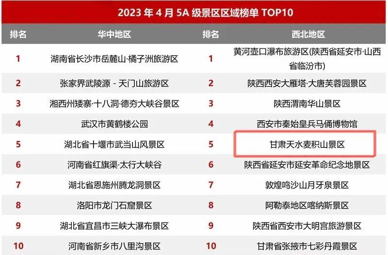 最新5A級景區(qū)百強出爐!麥積山大景區(qū)上榜!