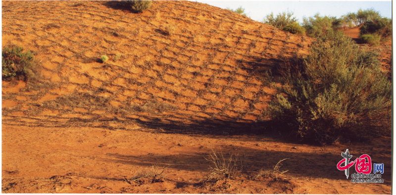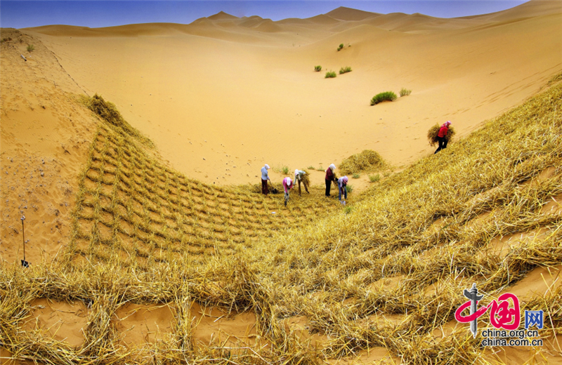 小小的“麥草方格”不僅阻止了流沙,防止了荒漠化,還加速了當?shù)亟?jīng)濟的發(fā)展。“麥草方格”固沙法即:將廢棄的麥草呈方格狀鋪在沙面上,然后用鐵鍬軋進沙中,留麥草的三分之一或一半立在四周,并在方格中植入治沙人經(jīng)九次試驗成功培育出的花棒、檸條等沙生植物,腐爛干枯的麥草還作為肥料滋養(yǎng)植物的生長。