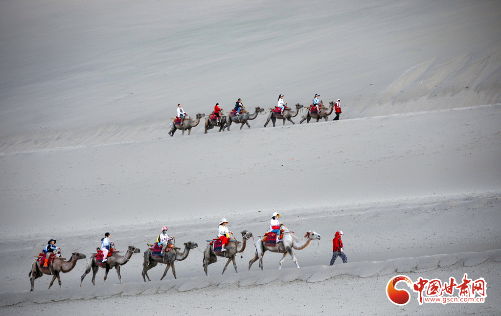 眼下正值甘肅省敦煌市旅游旺季,鳴沙山月牙泉景區(qū)持續(xù)吸引游客前來參觀游覽,這些駱駝每天更忙碌也更規(guī)律——早晨六點(diǎn)多“上班”,輪流休息,傍晚七點(diǎn)多“下班”。蜿蜒的駝隊(duì)在駝道上馱著游客在沙漠中漫步,成為鳴沙山月牙泉景區(qū)一道優(yōu)美的風(fēng)景線。