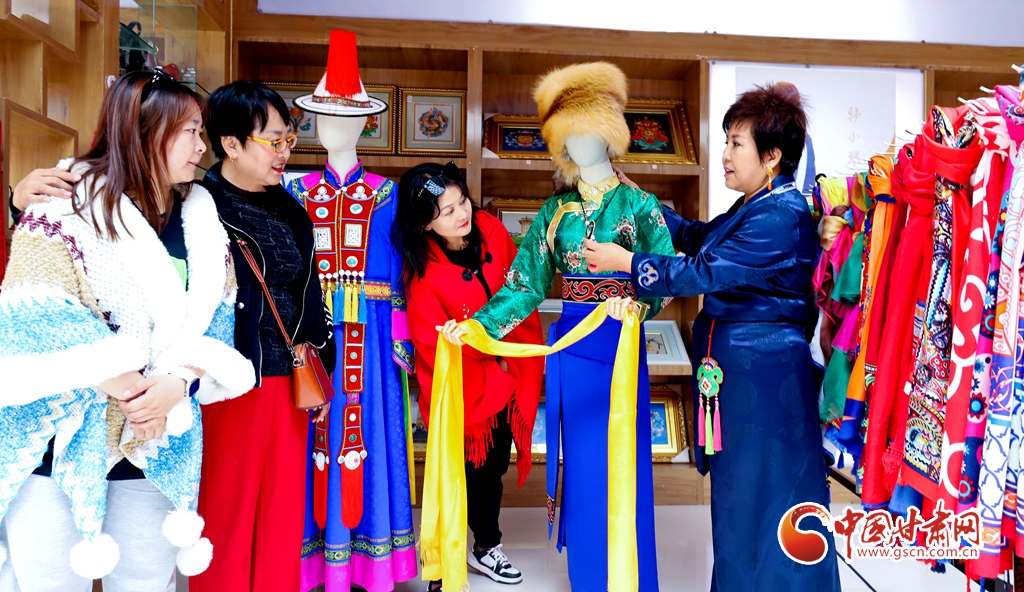 非遺傳承人在向游客介紹藏族、裕固族服飾