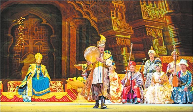 全劇主體部分由“佛門”“一念”“潛關(guān)”“問路”“遇險”“極樂”“高昌”“普度”“雪山”“祭天”“菩提”“那爛陀”“如夢”“大唐”14個章節(jié)構(gòu)成。每一個章節(jié)都把樂器與故事相結(jié)合,推動情節(jié)發(fā)展,表現(xiàn)人物內(nèi)心,從漢族傳統(tǒng)樂器笛、簫、塤、箏、鼓,到維吾爾族樂器艾捷克、薩塔爾、都塔爾,哈薩克族樂器冬不拉、庫布孜,塔吉克族樂器鷹笛、莎什塔爾,還有敦煌復(fù)原樂器箜篌、排簫、五弦琵琶,印度傳統(tǒng)樂器班蘇里笛等,呈現(xiàn)出來的樂器數(shù)量,令人驚嘆。據(jù)姜瑩介紹,全劇共演奏中外傳統(tǒng)樂器70余種。在舞臺呈現(xiàn)上,多媒體技術(shù)、舞美、燈光及服裝的綜合運(yùn)用,情景交融,新穎而獨(dú)特,給人一種身臨其境的真實感,沿著玄奘前行的足跡,大漠、星空、雪山……如在眼前。此外,劇目跨越時空,讓老年玄奘和青年玄奘隔空對話,將遼闊的時空壓縮于舞臺一瞬,以強(qiáng)烈的穿透力給觀眾以心靈上的啟迪和震顫。高昌王以樂會友部分,演奏人員從觀眾席上的出場,既讓人驚喜,也是一種沉浸式的觀看體驗,強(qiáng)烈的互動性和感染力,點燃了觀眾的熱情。