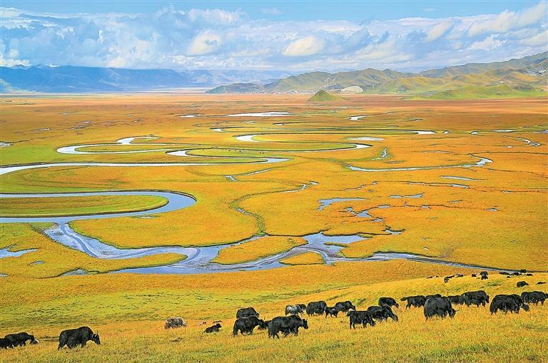 冬日的暖陽下,瑪曲縣的廣袤草原上牦牛成群。