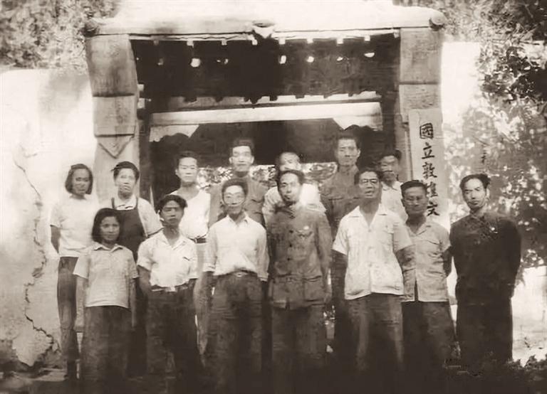 有一件事情在趙季平腦海里久久縈繞,難以忘懷。當(dāng)年,趙季平的父親、著名畫(huà)家趙望云曾有兩次不平凡的敦煌之行,但時(shí)隔多年,隨著時(shí)間的推移,他多次尋找父親敦煌之行的資料都未能如愿。這次在敦煌采風(fēng),趙季平又托朋友多方打聽(tīng),希望能幫助他尋找到那段難以釋?xiě)训臍v史。原敦煌市政協(xié)副主席高德祥先生多方努力,幾經(jīng)周折,終于在敦煌研究院的歷史檔案中發(fā)現(xiàn)了唯一一張照片:是趙望云代表人民政府接收國(guó)立敦煌藝術(shù)研究所時(shí),與張明坦、常書(shū)鴻、段文杰、李承仙、范文藻、孫儒僴等人在研究所大門(mén)前的合影。高德祥囑托好友韓蘭魁先生將照片帶給了趙季平。