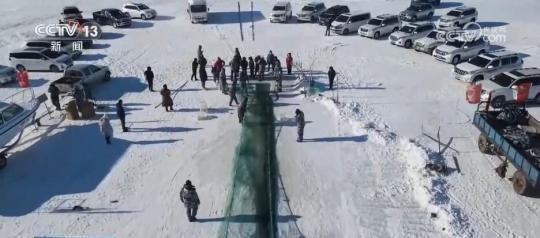 在克什克騰旗達(dá)里湖現(xiàn)場,人工鑿冰、冰下走網(wǎng),冬捕隊(duì)員在作業(yè)時(shí)選用5公分網(wǎng)眼,這樣捕魚時(shí)就能漏掉小魚。馬拉絞盤將大網(wǎng)拖拽出網(wǎng)口,滿載魚兒的漁網(wǎng)慢慢地從湖水中出來,游客們感受豐收的喜悅。