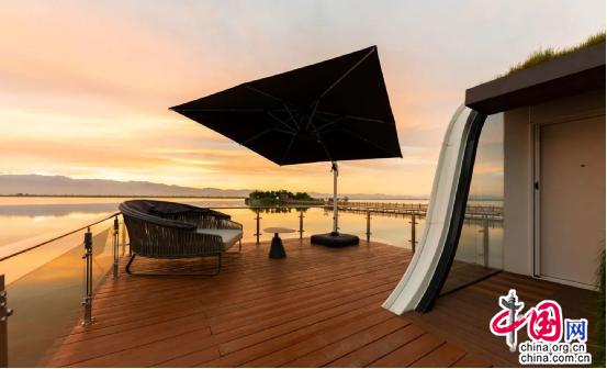 還有地球倉,與賀蘭山隔湖相望,超廣角的落地窗,猶如一個畫框,把房間外的風(fēng)景都放進了畫框里。與其他不同的是,白天可將房間內(nèi)的自動升降床上升至房頂,露出隱藏在床底的沙發(fā)和茶桌,臥室即可秒變“會客茶室”。