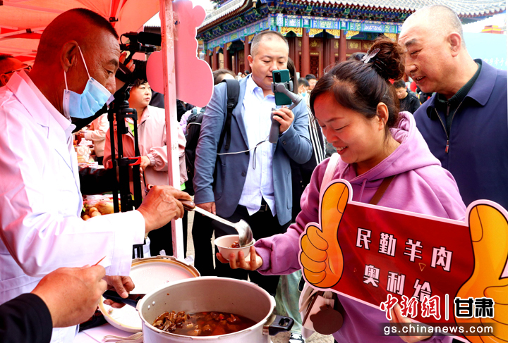 3月下旬,民勤縣在天水啟漢樓廣場(chǎng)舉行推介會(huì),宣傳本地旅游資源和農(nóng)特優(yōu)產(chǎn)品。圖為游客一邊品嘗民勤羊肉,一邊聆聽美食背后的文化和故事。 周旦 攝