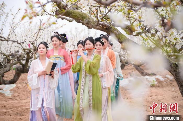 原標(biāo)題:山東萊陽萬畝梨花惹人醉 民眾著古裝游園
