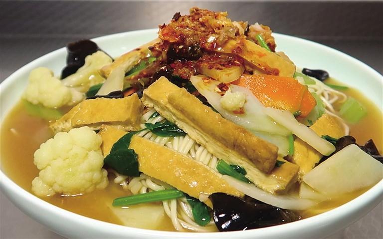 搭配吸滿醬汁的油炸凍豆腐,再淋上一口酸辣蒜汁,這種來(lái)自碳水的誘餌很難令人抵抗。蘭州鹵面的面條與牛肉面一樣,都是技藝精湛的拉面師傅親手拉出來(lái)的,湯汁用油炸凍豆腐和多種素菜混以牛肉面原湯勾芡,文火慢煮,再澆到新出鍋的面條上。