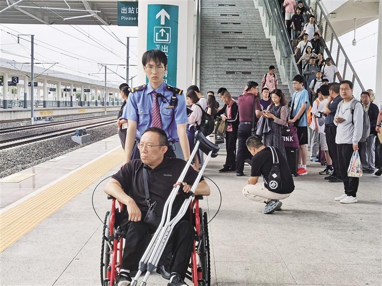 “站臺邊的旅客請往安全白線里走,帶小孩的旅客,看好自己的孩子!”這句話,每趟車劉鑫都要重復十多遍。暑運以來,列車密集到發(fā),短短3個半小時就到發(fā)列車17趟??瓦\值班員劉鑫不停地在不同站臺間來回奔波,不僅要與列車長辦理交接,而且要做好旅客乘降引導和安全防護。