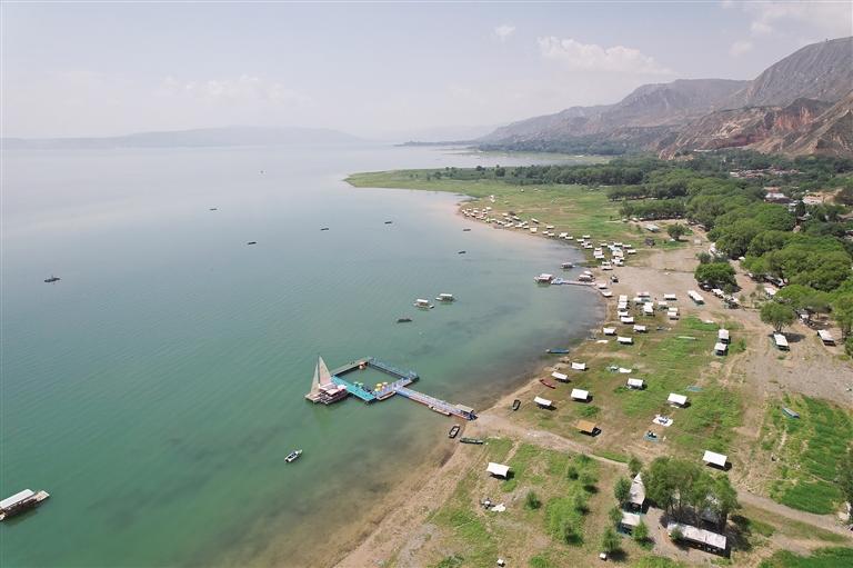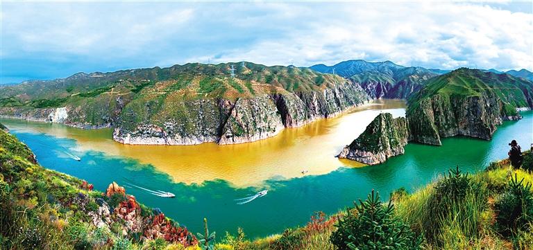 提及永靖劉家峽,第一反應(yīng)就是一個(gè)成語(yǔ)——“涇渭分明”。受上游降水影響,洮河河水比較渾濁,在與黃河交匯處劉家峽水庫(kù)的清波“相遇”時(shí),形成一清一黃兩股水流,河流呈“Y”字形交匯。交融卻不滲透,加上河中的石山,猶如兩條巨龍游戲于此,在當(dāng)?shù)剡@一景象也被稱為“二龍戲珠”。初秋時(shí)節(jié),來自全國(guó)各地的游客站在黃洮交匯觀景臺(tái)上,感受這份來自大自然的震撼與壯美,從高處遠(yuǎn)眺入河口,“黃河清,洮河黃”,可謂“涇渭分明”,景色極為壯觀。