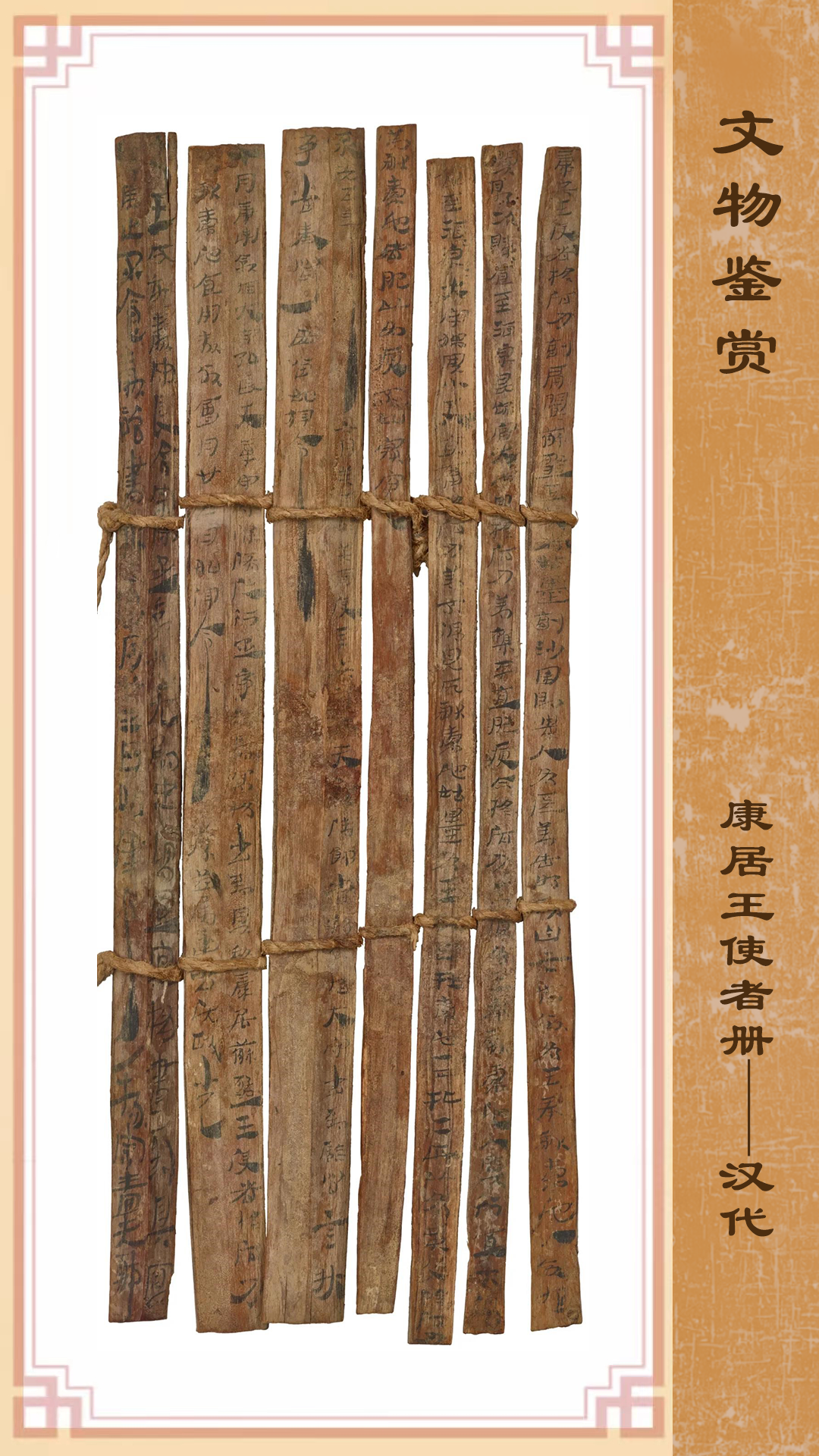 這份珍貴冊(cè)書記錄內(nèi)容為:永光五年(公元前39年),康居王使者和蘇薤王使者及貴人所獻(xiàn)的貢物在酒泉評(píng)估時(shí)發(fā)生了糾紛,朝廷責(zé)令敦煌郡和效谷縣進(jìn)行調(diào)查并將當(dāng)時(shí)的情況如實(shí)上報(bào)。該冊(cè)書的出土,不僅為研究當(dāng)時(shí)的行政和司法審判程序提供了第一手資料,更重要的是為研究漢朝與康居國(guó)的關(guān)系提供了原始資料,亦是今天的中亞各國(guó)研究本國(guó)古代歷史的重要資料,可補(bǔ)傳世史籍之闕載。現(xiàn)藏甘肅簡(jiǎn)牘博物館。