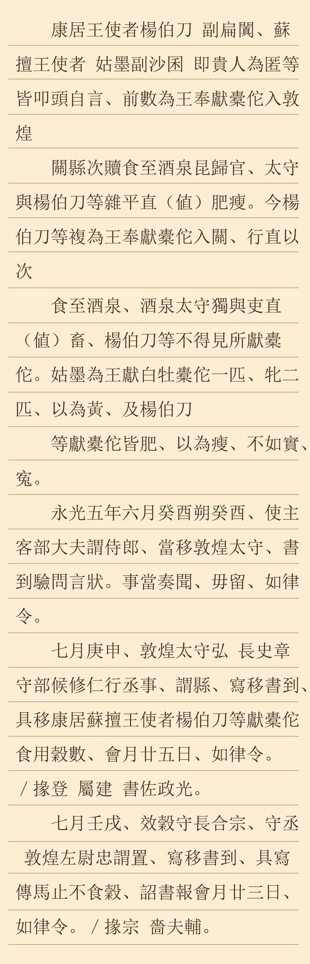 永光五年六月初一日(公元前39年7月21日),朝廷主管對(duì)外交往和蠻夷事務(wù)的使主客諫大夫行文敦煌,要求敦煌太守接到文件后對(duì)此進(jìn)行查詢并按時(shí)上報(bào)中央,不得留遲。七月庚申(9月6日),敦煌大守弘、長(zhǎng)史章以及兼行丞事的守部候修仁聯(lián)署文件,下發(fā)效谷縣,要求縣廷接到文件后,將康居王使者路過(guò)縣境時(shí)為之提供的谷物數(shù)量,在七天之內(nèi)上報(bào)太守府。文書中有發(fā)文時(shí)掾、屬、書佐的具名。