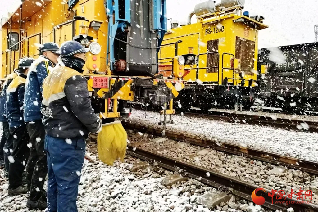 武威工務(wù)段芨嶺、山丹線路車(chē)間以雪為令,組織干部職工清掃道岔尖軌、滑床板、轉(zhuǎn)轍機(jī)等關(guān)鍵部位的積雪積冰,確保線路狀況良好。