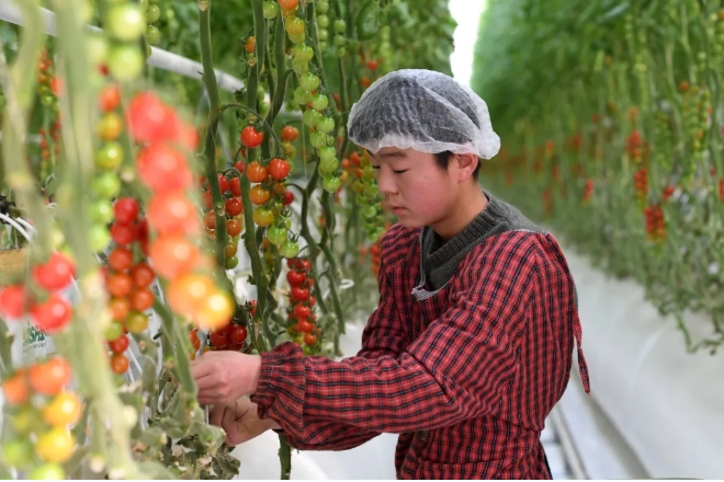 在古浪縣黃花灘生態(tài)移民區(qū)富民新村現(xiàn)代化智能玻璃溫室,村民在管護(hù)番茄 范培珅 攝