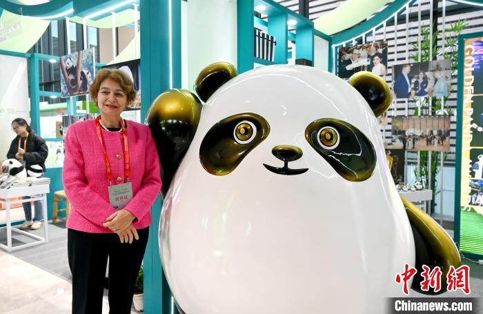 11月26日,四川成都,聯(lián)合國(guó)教科文組織前總干事、歐盟亞洲中心董事會(huì)高級(jí)顧問伊琳娜·博科娃與大熊貓玩偶合影留念。中新社記者 安源 攝