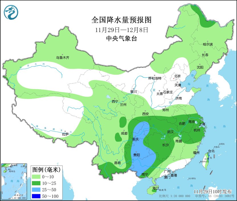 未來10天(11月29日-12月8日),東北地區(qū)中北部、內(nèi)蒙古東北部等地部分地區(qū)累計(jì)降水量有8~15毫米;西南地區(qū)東部和南部、江漢、江淮、江南西部和北部、廣西西部及臺(tái)灣島等地部分地區(qū)有10~20毫米,局地30~60毫米;云貴高原、內(nèi)蒙古東北部、東北地區(qū)等地部分地區(qū)累計(jì)降水量較常年同期偏多1~3倍,我國(guó)其余大部地區(qū)降水偏少。