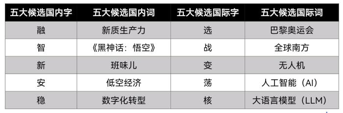 國內(nèi)字詞前五位分別是“融、智、新、安、穩(wěn)”和“新質(zhì)生產(chǎn)力、《黑神話:悟空》、班味兒、低空經(jīng)濟(jì)、數(shù)字化轉(zhuǎn)型”;國際字詞前五位分別是“選、戰(zhàn)、變、蕩、核”和“巴黎奧運(yùn)會、全球南方、無人機(jī)、人工智能(AI)、大語言模型(LLM)”。