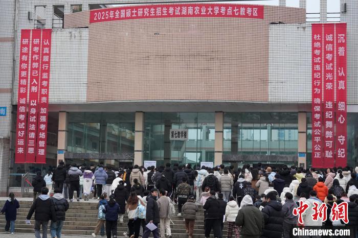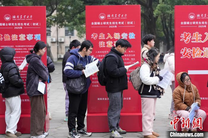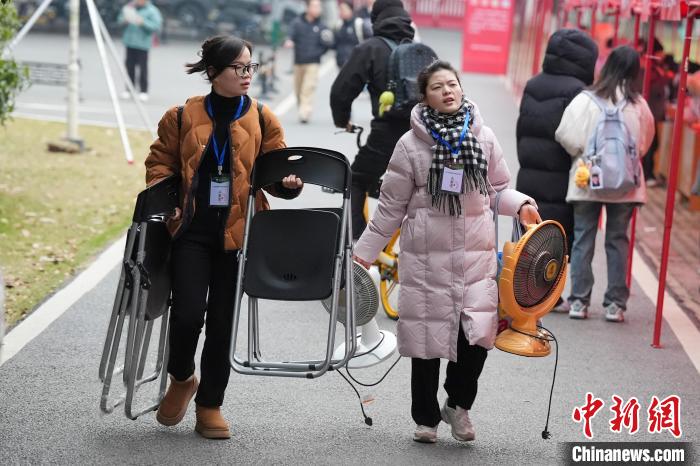 12月21日,2025年全國碩士研究生招生考試初試開考,眾多考生來到湖南農(nóng)業(yè)大學考點參考。據(jù)教育部數(shù)據(jù)顯示,2025年全國碩士研究生報名人數(shù)為388萬,相比去年下降50萬人,已是連續(xù)兩年報名人數(shù)下降。圖為志愿者將椅子與取暖設備送入考場。中新社記者 楊華峰 攝